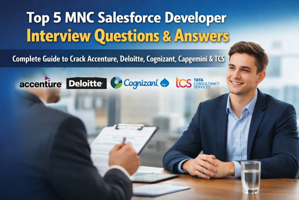 Here, you’ll discover real interview questions and detailed answers frequently asked by top MNCs like Accenture, Deloitte, Cognizant, Capgemini, and TCS — everything you need to confidently crack your Salesforce Developer interview.